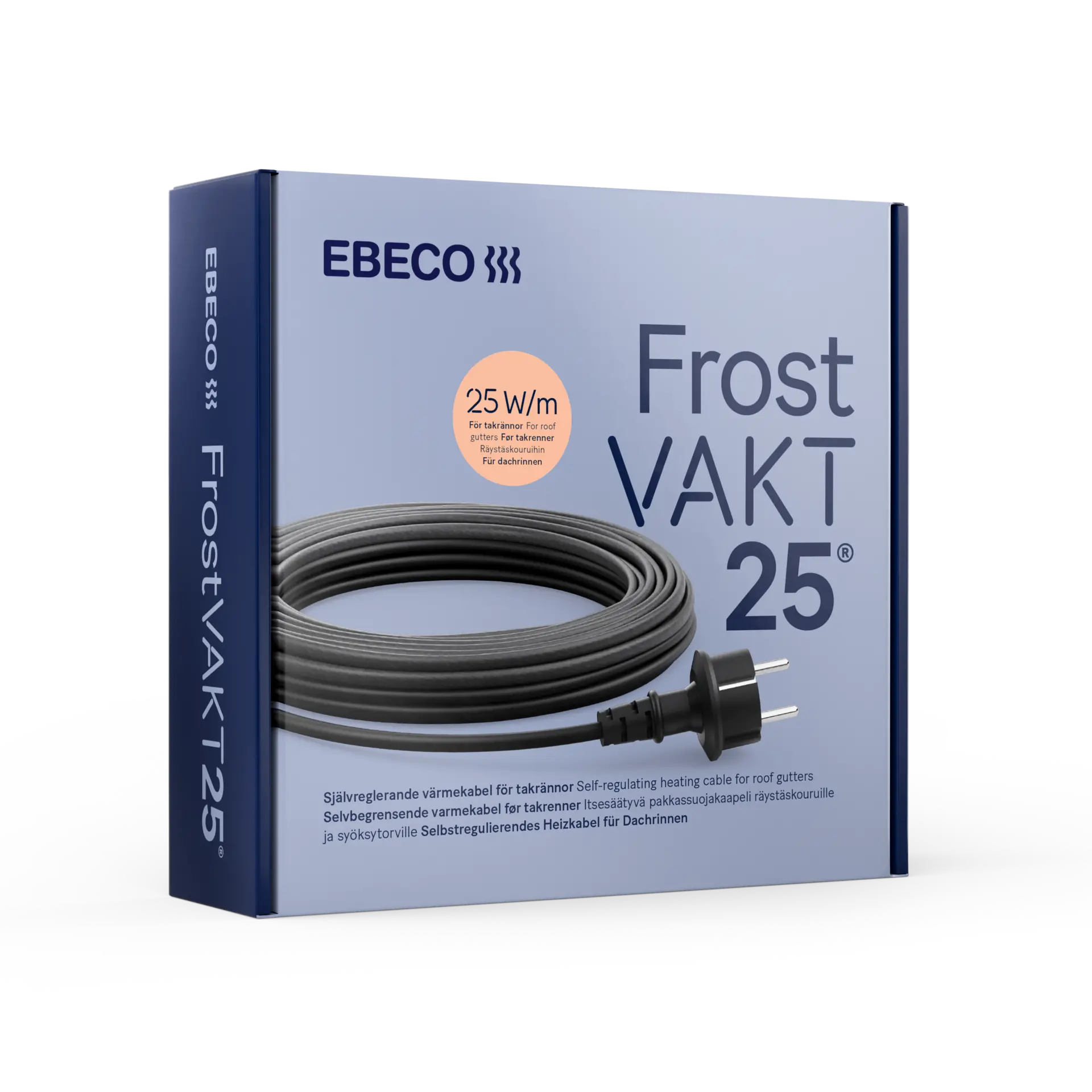 Frostvakt 25 har en 4 meter lang ferdigmontert tilkoblingskabel med støpsel og er utmerket å bruke for midlertidige installasjoner i takrenner og nedløpsrør. Du fester den enkelt i rennen ved hjelp av Ebeco Smartclip og kobler til et jordet vegguttak, 230 V, via jordfeilbryter. Frostvakt 25 kan brukes utvendig på rør Ø 75 mm eller større. Et rør med Ø 110 mm og 20 mm isolering tåler –30 °C når det beskyttes med Frostvakt 25.